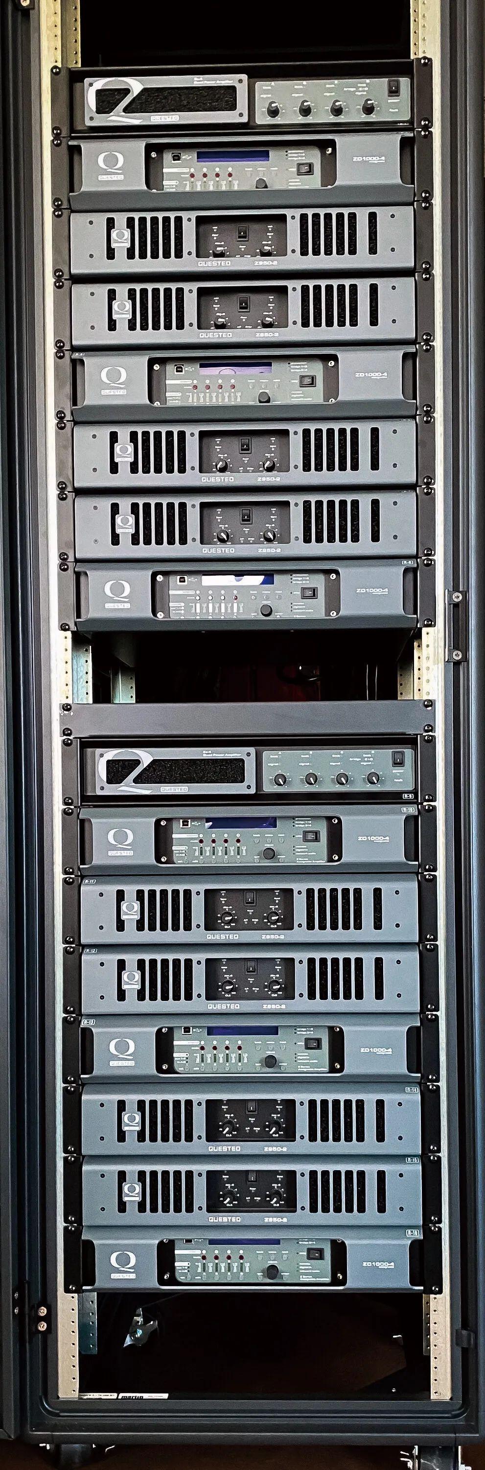 驾驭如此多的音箱组合,系统中所用的QUESTED(罗杰之声)数字放大器是市场上最模拟的声音。它们支持输入数字AES信号、Dante信号或模拟XLR平衡口信号。