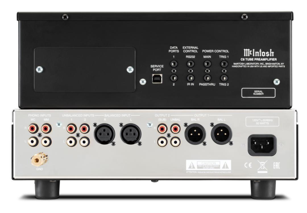 配備電子管的C8前級在氣質上更加接近經典的MC275,儘管尺寸緊湊,但前級所具備的接口它都具備,背面甚至還預留了可安裝DA2解碼插件模塊的位置(包括2×同軸、2×光纖、USB Type B、HDMI ARC和MCT)。在模擬輸入方面,C8有一組XLR平衡輸入,兩組RCA單端輸入,足夠讓你連接任何訊源。除此之外,C8還有兩組RCA唱放輸入,包括MM/MC各一組,為黑膠唱盤用戶省掉了唱頭放大器環節的投入。要知道的是,這是McIntosh專門打造的內置唱放組件,對於有打算「墮入黑膠坑」的玩家,這是一個巨大的誘惑。