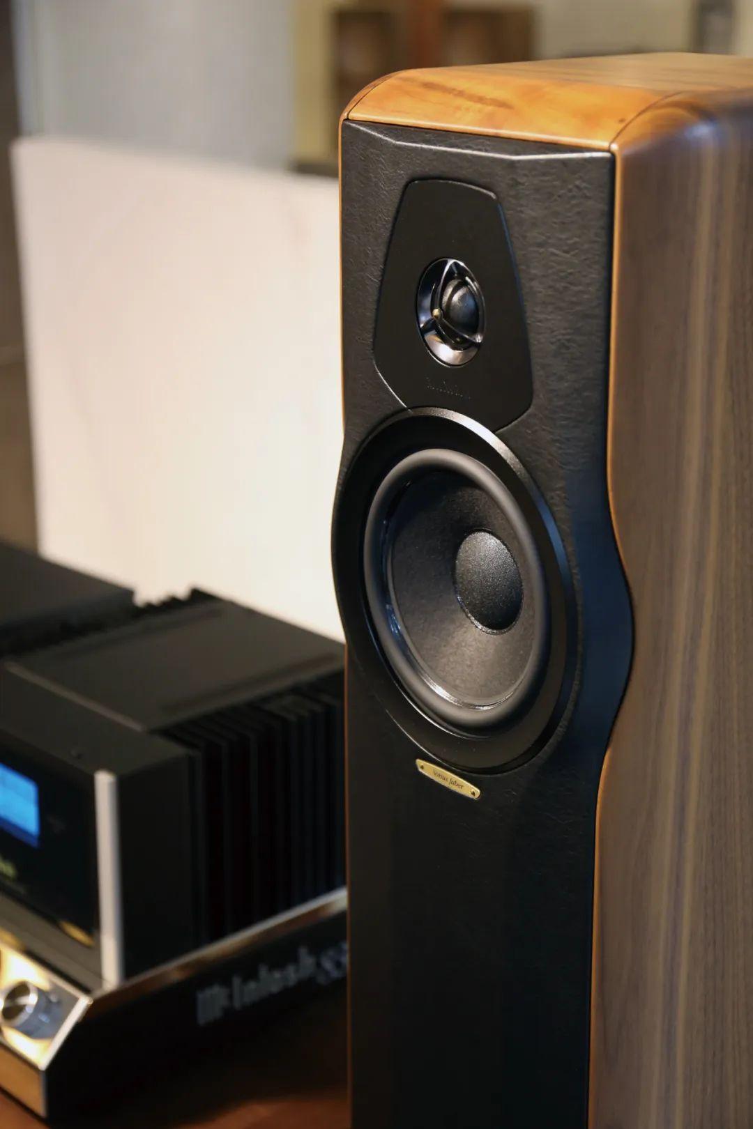 現場由上述McIntosh全套「西裝」驅動有「完美情人」之稱的Sonus faber Maxima Amator座地式音箱。Maxima Amator是Sonus faber Heritage經典系列的第三款產品,同時也是該系列唯一的座地音箱。這款音箱採用了典型的兩音路低音反射式設計,箱體全部由實木製成,是Sonus faber研發團隊多年辛勤努力的結晶。內部以複雜的分隔設計,獲得不同阻尼和隔振特點,也令聲音實現最優的效果。音箱採用手工製作的皮革覆蓋,底座由天然石材製成,穩重而高檔。