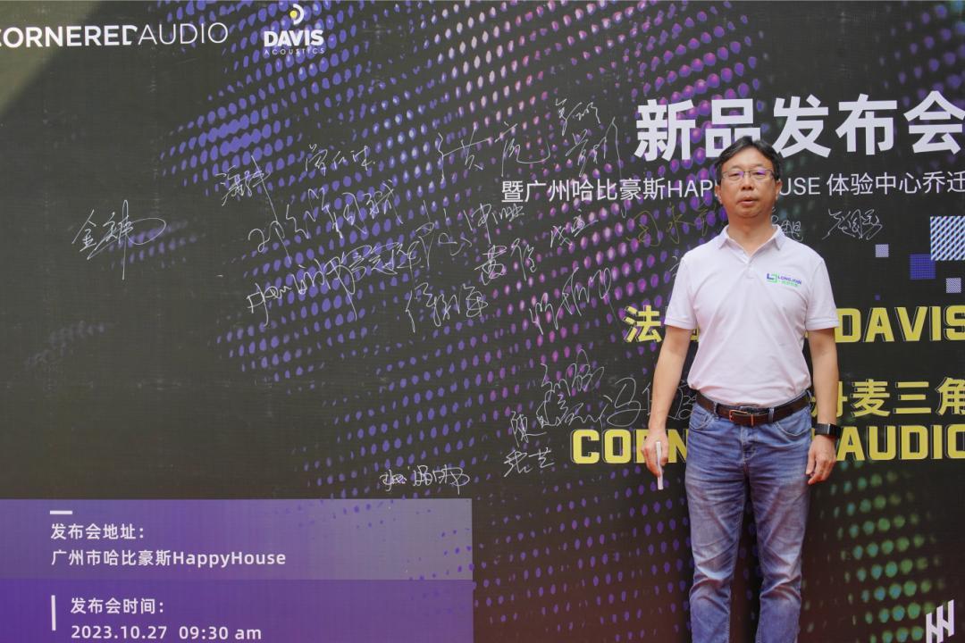 广州市哈比豪斯联合创始人邓红星先生对现场到贺的嘉宾表示感谢,并现场介绍了CORNEREDAUDIO(丹麦三角音响)和Davis(法国戴维斯)两个品牌。