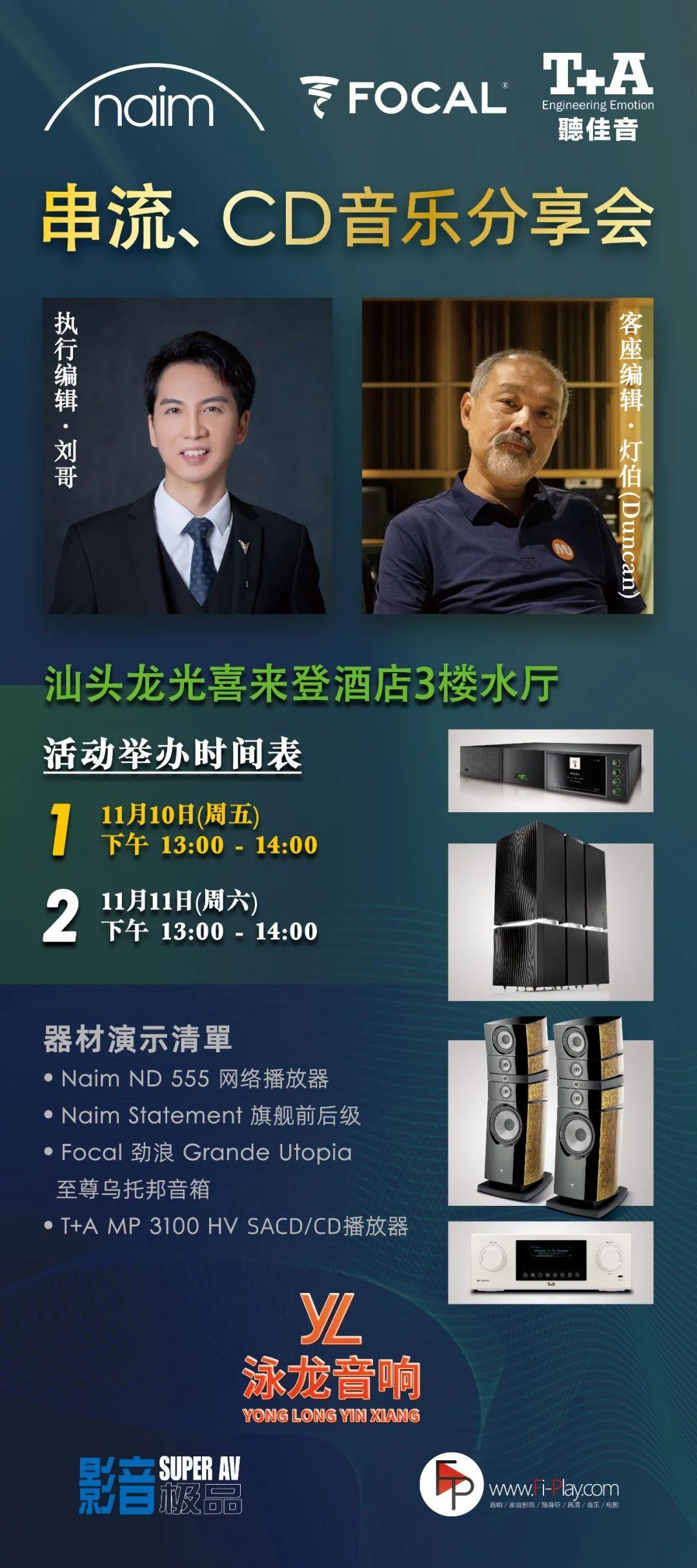 2023 汕頭國際音響展將於2023年11月10日-12日(周五至周日)在汕頭龍光喜來登酒店盛大舉行,為期三日的展會,汕頭泳龍音響將攜頂級音響品牌和產品亮相展會(三樓水廳),恭候各位發燒友蒞臨聆聽。
