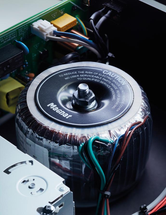 细看机内的电源配置,MC 200采用了Hi-Fi级别的环形变压器,并且经过磁屏蔽处理,输出功率为35W×2(20Hz~20kHz,THD<1.0%,4Ω负载),峰值输出更可达到75W×2。功能上,MC 200支持Hi-Res 24bit/192kHz音频码流和档案,通过小巧的MC200能让你感受到优于CD质量的高分辨无损音质的魅力。其中流媒体播放包括Spotify和Internet Radio。而串流访问则可以通过MC200访问家中网络存储设备(NAS)中的音乐档案。MC 200额定每声道输出功率为35W(4Ω),峰值功率输出高达75W。同时也具备低音炮的输出连接,方便用户搭配2.1系统。输入端方面,MC 200配备2组RCA、1组前置3.5mm(可用于连接随身听)以及光纤和同轴的数字端和LAN网络端。