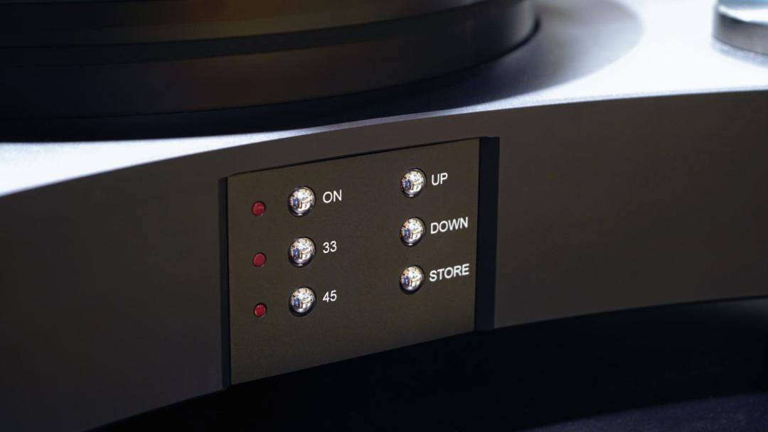 唱盘机身的前面板有一些按键,包括开关、33转和45转、转速加快和转速减慢、转速存储。其中转速存储便于自定义的转速状态进行保存和调用,非常人性化。
