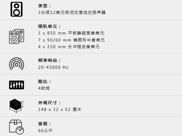 將中頻能量均勻的由7 只驅動器釋放,這意味着每隻驅動器都在非常低的壓力水平下工作,增加了動態餘量。Mag 850 平面靜磁高音單元驅動器由項目總監 Max Kirschke 開發,整齊的排列着 64 只特殊形狀的釹磁鐵,每個間隔的距離都經過了精準的計算。與 Kapton 振膜相連接的導體長度約為 40 英尺,以一前一後的方式排列,這樣能使振膜能夠被均勻驅動。Mag850 的振膜厚度以微米為單位,比頭髮絲還更薄。平面靜磁單元中與振膜相貼合的導體好比是音圈,但是以直線拉伸形式。在這兩種驅動器類型中,傳到到導體的音頻信號會產生一個變化的磁場,該磁場與磁鐵提供的固定磁場相互作用,驅動振膜來回移動產生聲音。平面靜磁單元的優點是其極低的移動質量(完全擺脫重力的影響),這就擁有了卓越的瞬態響應(振膜啟動和停止速度更快),還有這比傳統球頂高音揚聲器大得多的發聲面積。