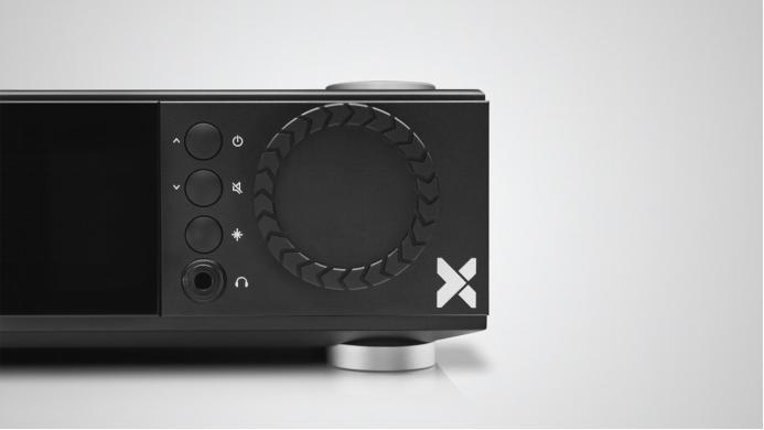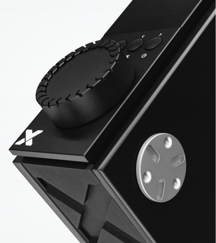 前面板左侧为大型显示屏幕,右侧为竖列快捷按钮(开关、静音、信道切换/菜单和1/4英寸耳机接口)和大型音量旋钮,机箱厚实的侧板雕刻了“X”的符号,顶部和底部使用天然木纤维树脂复合材料,对声音迟滞的改进特别明显。顶部有与机脚贯穿设计的支撑金属座垫(还配备了钛珠凹槽),方便器材叠放使用,以此获得最发烧的声音表现。