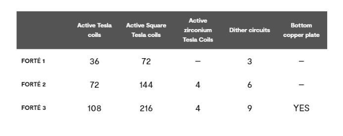 而三款产品之间的区别主要在内部Tesla线圈和抖动电路使用数量的程度不同,通过应用来自Ansuz Tesla线圈技术,以此消除电路中的噪声,令Axxess拥有AGD集团标志性性能和质量标准以及再现自然的声音。通过上述的截图可以看到,针对Active Tesla Coils(主动特斯拉线圈),Forté 1使用了36个,Forté 2使用了72个,而Forté 3使用了108个;针对Active Square Tesla Coils(主动式方型特斯拉线圈),Forté 1使用了72个,Forté 2使用了144个,而Forté 3使用了216个;针对Active zirconium Tesla Coils(主动式锆特斯拉线圈),Forté 2和Forté 3一样均使用了4个;而在Dither circuits(抖动电路)上,Forté 1使用了3个,Forté 2使用了6个,而Forté 3使用了9个。且Forté 3是唯一设计了底部铜板,以抑制微振动,作为旗舰的Forté 3在用料上都是顶配的。而相比之下,Forté 1所用到的上述线圈更少,价格方面自然会更加实惠和亲民。