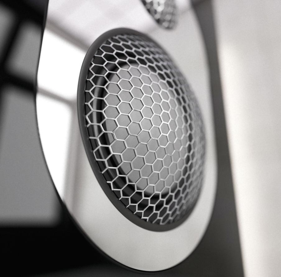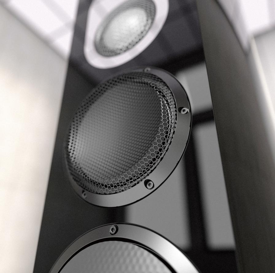 Septet座地式音箱使用的單元數量多達7隻,包括前面板的5隻主動式單元和背板上的2隻被動式輻射器。6000-40000Hz的高頻段由1隻特別定製的直徑1英寸純鑽石振膜高音單元負責,鑽石振膜重量低剛度高,能夠快速振動而不會發生變形,失真極低,同時也可以快速消散音圈產生的熱量,不會因頻率過高出現金屬振鈴現象。負責800-6000Hz中高頻段的1隻直徑3英寸純鈹振膜中高音單元也是特別定製,並且與鑽石振膜高音單元一起安裝在橢圓形的金屬面板上。鈹振膜這種材料比陶瓷更輕,強度也更高,能夠提供更快的瞬態響應和更高的效率,同時具有阻尼高、共振低的優點。
