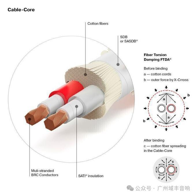 FTDA®提供高效的導體阻尼,並大幅降低由導體在地球磁場中振動和運動引起的電動噪聲。為了確保足夠高的衰減比,選擇棉纖維作為阻尼材料,因為它具有較高的縱向強度和填充能力。此外,棉纖維內部和之間的高百分比空氣降低了相對滲透性和信號能量損失。高纖維間扭轉和低填料密度可增強對整個頻譜範圍內影響線材的機械振動的吸收高達50倍,並確保可達到的最寬動態範圍,在這種情況下,動態範圍主要受到熱噪聲和熱電接觸電位的限制。