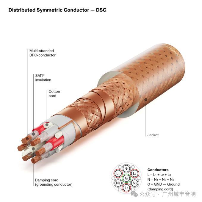 專利DSC技術全稱為Distributed Symmetrical Conductor分佈式對稱導體,是專門為Tchernov高端Refrence和Ultimate系列線材開發的。能量傳輸通過由三個相似導體組成的兩條線路進行,圍繞中心接地導體或中心阻尼線配置為六邊形結構(3+3+1),具有最大的封裝係數和一致性。