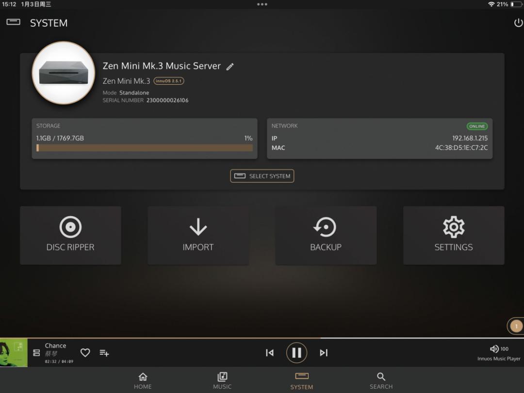 不要小觑ZENmini MK3体积小巧,前面板还有“一缝”吸入式碟仓,这个碟仓主要功能是提供给传统音响爱好者(家中有众多CD的收藏者)“抓轨”使用(没有CD播放功能),可以把CD唱片以FLAC或WAV的格式存储到内部的硬盘之中。需要称赞的是,通过Innuos Sense可以把“抓轨”的音乐档案进行信息获取,包括专辑名、曲目名和封面信息等等,比通过电脑“抓轨”更加人性化和便捷。