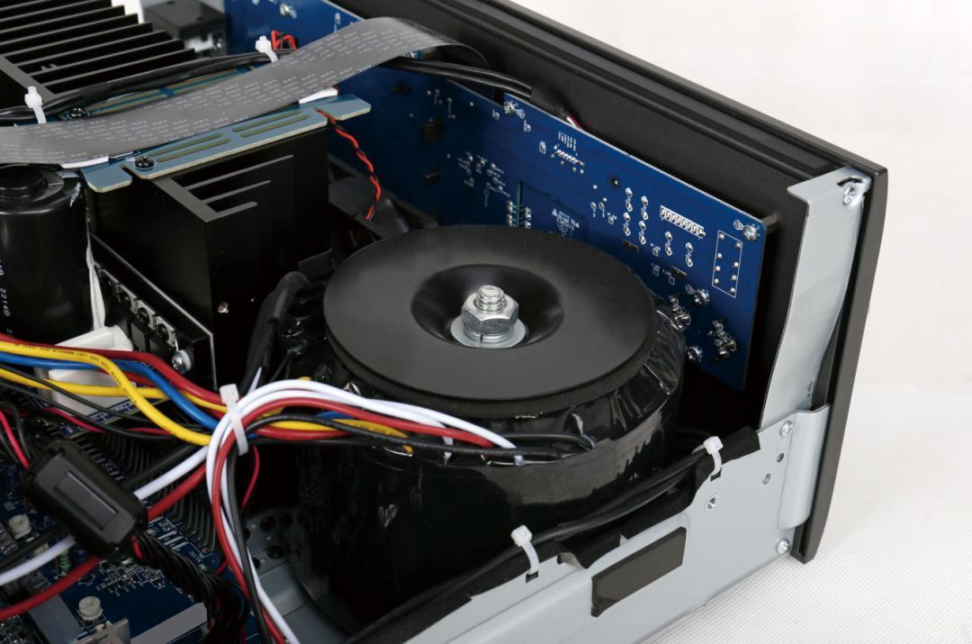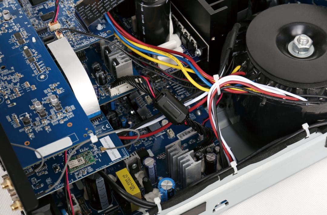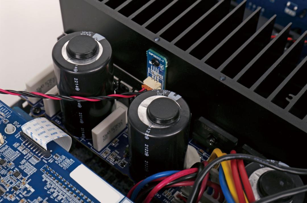 讓我最直觀感受到AVR31在性能和指標上的提升,首先是產品的重量和當中滿滿的結構和用料。在我搬動AVR31時明顯感到比AVR21更重,挪動更費勁。內部採用了品牌精心設計的環形變壓器,可提供充沛的電力供應,同時有着極低的噪聲表現。由於功率更大,功耗和熱量也會更多,為此內部散熱片也相應加厚和加重,碩大的4支ELNA電容頂部還增加減振貼膠,可見品牌是以發燒的思路來設計影音接收機。