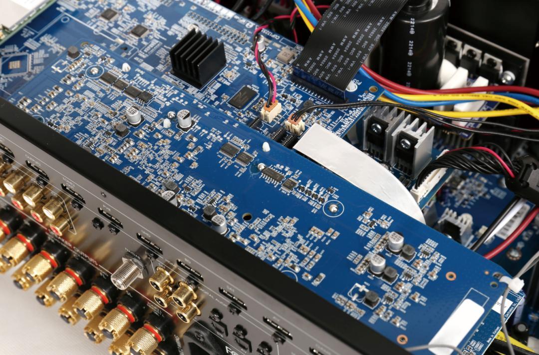 AVR31內部電路採用非常合理的立體布局,HDMI輸入電路、數字輸入電路和模擬輸入電路都以立體層式分佈,在減少應有干擾的同時也做到最短路徑的連接和傳輸,而底部則為功率電路,隱約能看到整齊劃一的功放管和緊貼的獨立散熱片。