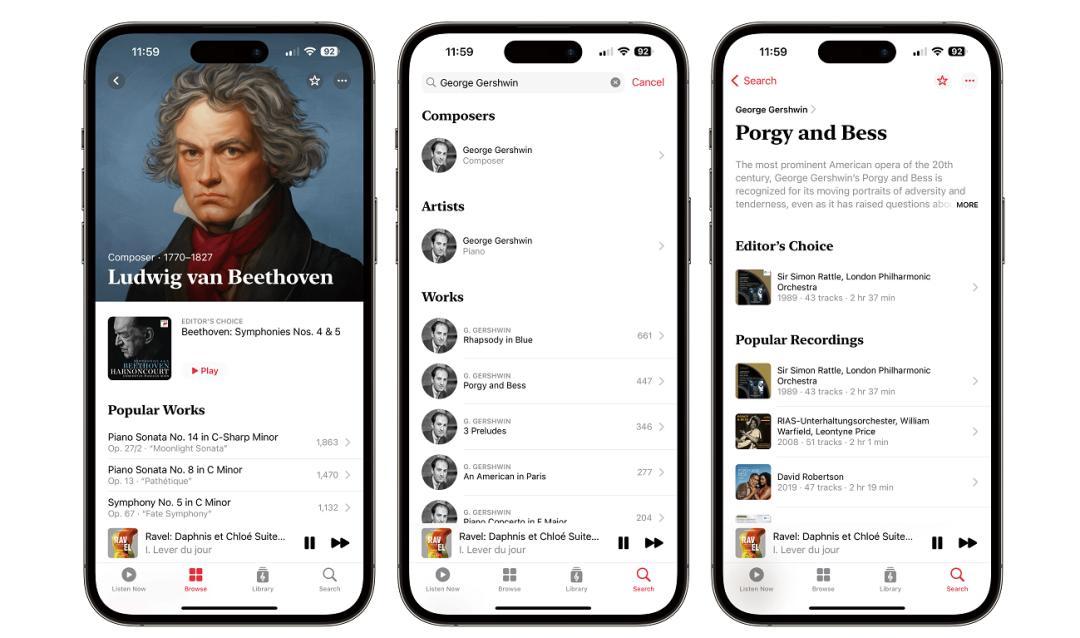 “Apple Music古典乐”作为苹果的一个原生App,它的出现让我们找到一首古典音乐变得更简单。当我们在国内一些音乐平台搜索流行歌曲,输入一个歌曲名之后,页面信息将以歌曲名、歌手、专辑、时长显示,足够我们精准播放某个版本。然而,这些信息不足以精准查找古典音乐。编写古典音乐乐谱的是作曲家,他们的成果称之为作品,而同一部古典音乐作品,很可能被无数音乐家演绎,因此诞生不同版本的录音。举个例子,以标准格式命名的贝多芬《第五交响曲》(Symphony No.5 in C Minor, Op.67)。作为贝多芬最受欢迎的作品之一,《第五交响曲》在1808年首演以来,就一直是交响乐团常规曲目,也是古典音乐史上最经常演奏的作品之一。其中一个录音版本由维也纳爱乐乐团演奏,莱奥纳德.伯恩斯坦担任指挥。在一般音乐平台或App,如要精准找到这个维也纳爱乐乐团的版本,恐怕要耗费相当一部分精力,因为元数据和搜索算法根本不适合古典音乐。
