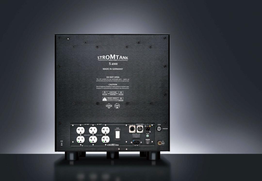 於是,Stromtank品牌的電源處理器就充當一隻巨大的「電池」:從自己輸入端接入家用交流電源,將其轉換為直流電,儲存在電池模組之中。然後將音響器材連接到自己的輸出端,電源供應器再將內部儲存的直流電轉換為交流電,從輸出端輸出驅動連接的音響器材。