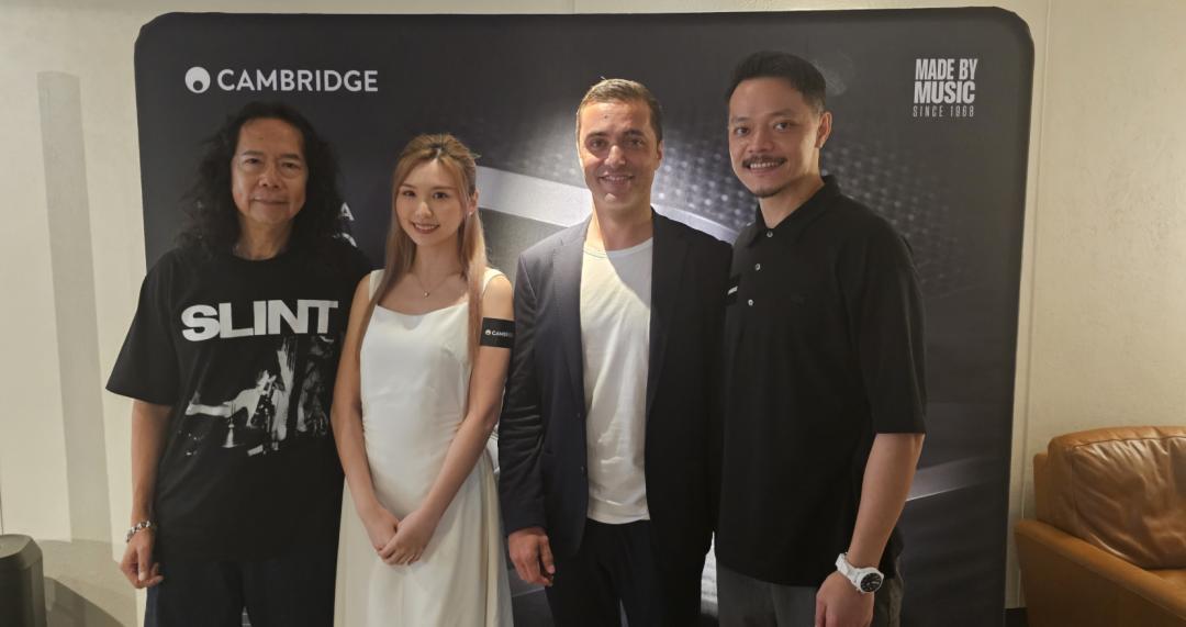 发布会现场,太极乐队主音吉他手邓建明Joey Tang(左一)和Cambridge Audio CSO(首席销售官)Jean-Philippe Fontaine(右二)、Cambridge Audio亚洲区销售总监Calvin Yeung杨景麟先生(右一)