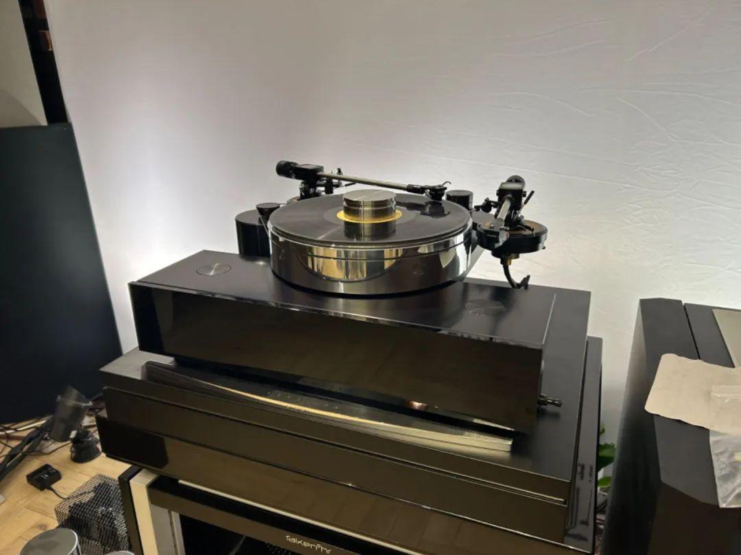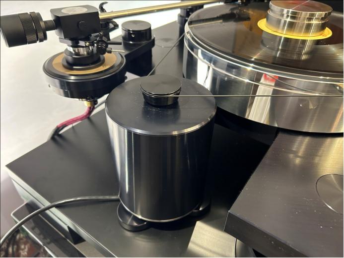 现场Volker介绍到,Aerolith Reference黑胶唱盘是他30年磨一剑的终极理想的黑胶唱盘杰作,直到现在最终推出,整个唱盘总重量包含专为该唱盘而设计的底座重达80kg,当中拥有Volker众多理想设计。为了让Aerolith Reference黑胶唱盘拥有如陨石般永远悬浮的特点,唱盘与底座之间设计了用户可自行充气的气压垫脚座,类似汽车的气压轮胎(前2后1),令黑胶唱盘实现全平台的“气浮”,这种独特的专利技术具有极佳的阻尼和解耦特点,能有效消除各种振动对黑胶唱盘的干扰。同时唱盘结构并非整块板式,而是T型支架,因此对消除振动非常有好处。
