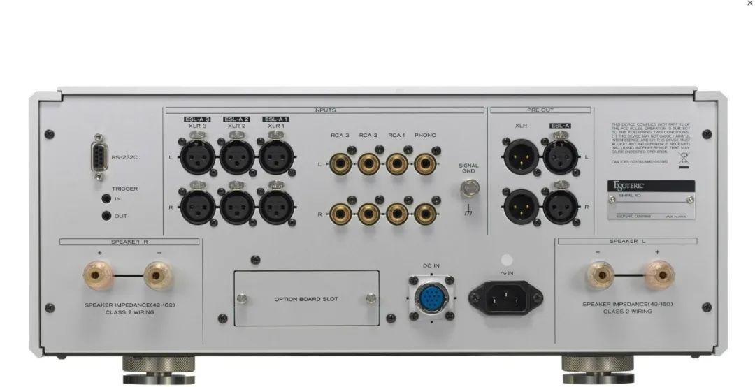 - 包含3组ES-Link模拟输入,支持从Esoteric K/N系列数字源播放器输入专有的基于电流的信号,提供现场聆听体验。