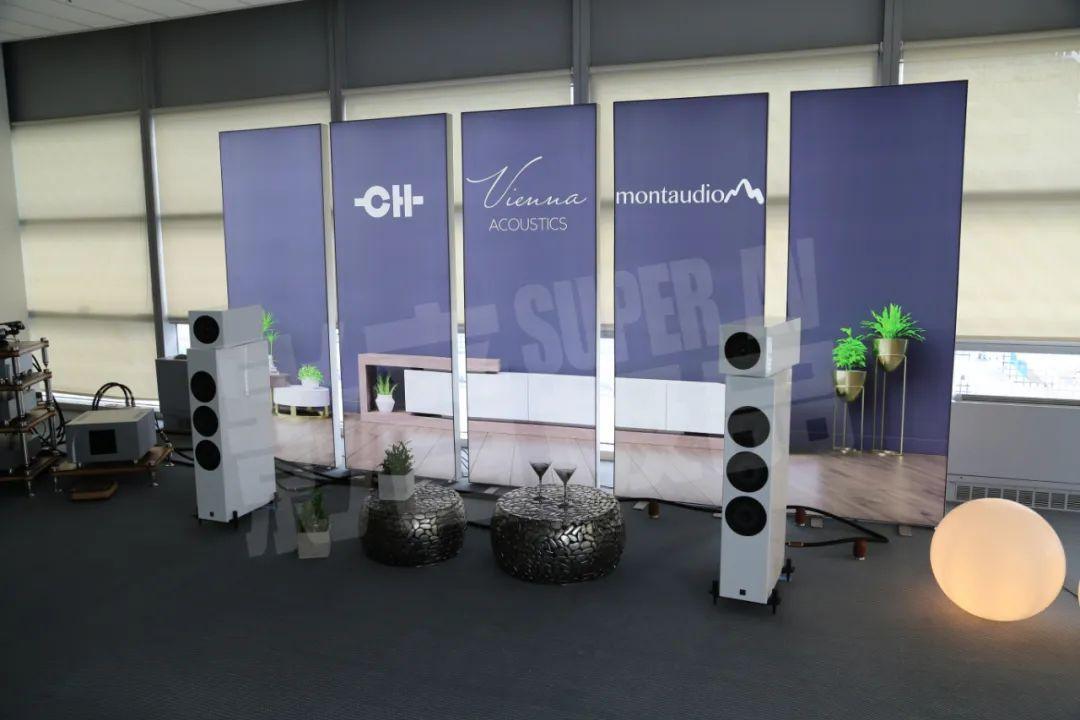 Vienna-Acoustics本年展示了两套系统,分别是无源的Liszt-Reference音箱和有源的Mozart-Infinity音箱,前者由全套瑞士CH Precision驱动,并加入Montaudio全套线材、线托、地盒和机架等产品。Liszt-Reference最大的特点就是中高音同轴单元的独立箱体可以根据皇帝位位置进行中心旋转调节发声指向。
