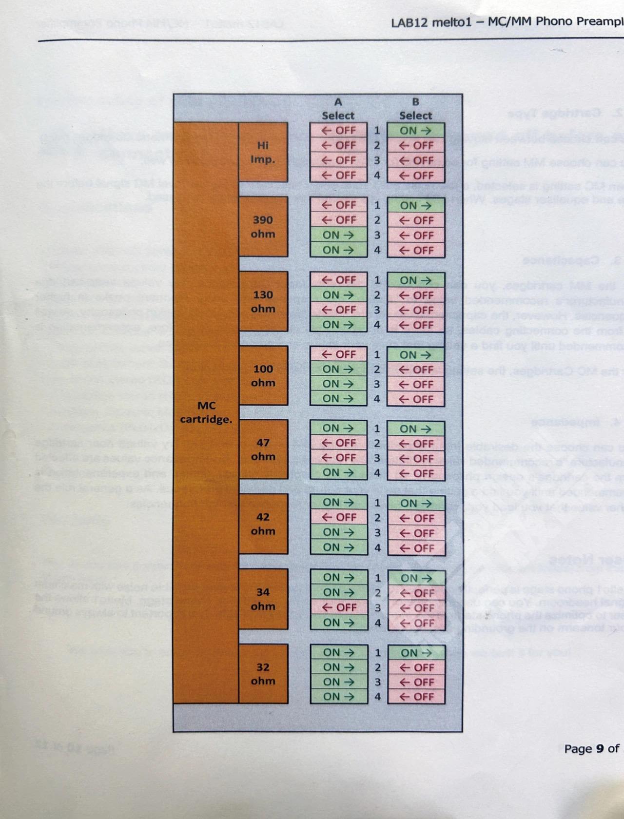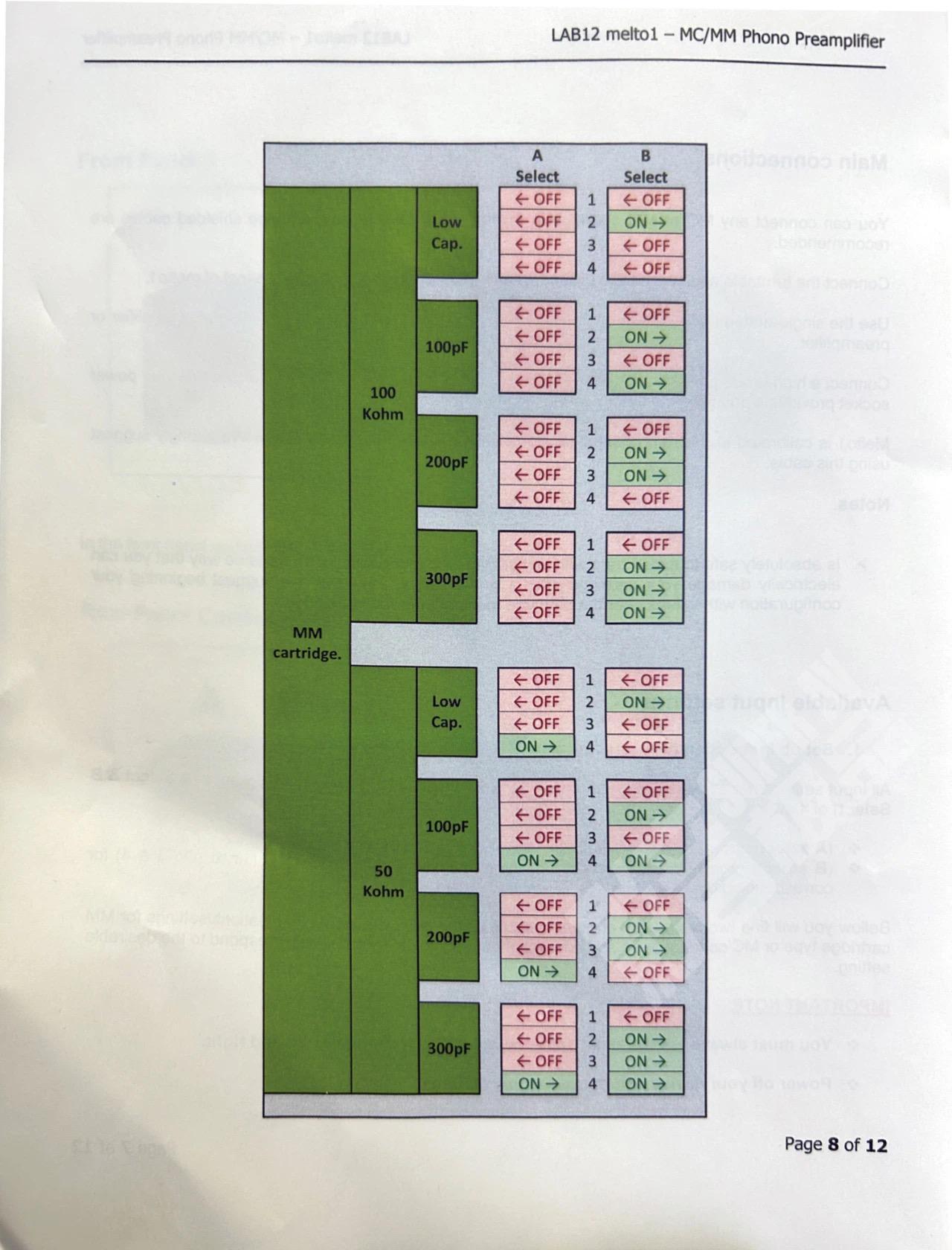 对应不同的唱头参数,用户可以根据说明书来相应调节Melto1背面DIP开关设置(我把说明书的设置页面在此分享给大家)。例如以我搭配Ortofon 2M Bronze MM唱头,唱头阻抗为47kΩ,建议容抗为150-300pF,对应说明书则在A Select和B Select中选择50kΩ-200pF/300pF选项(上下两组均为L/R两声道之意,设置一致即可),至于选取哪个容抗值更合适,可以根据个人听感的喜好再在下一步进行选择。