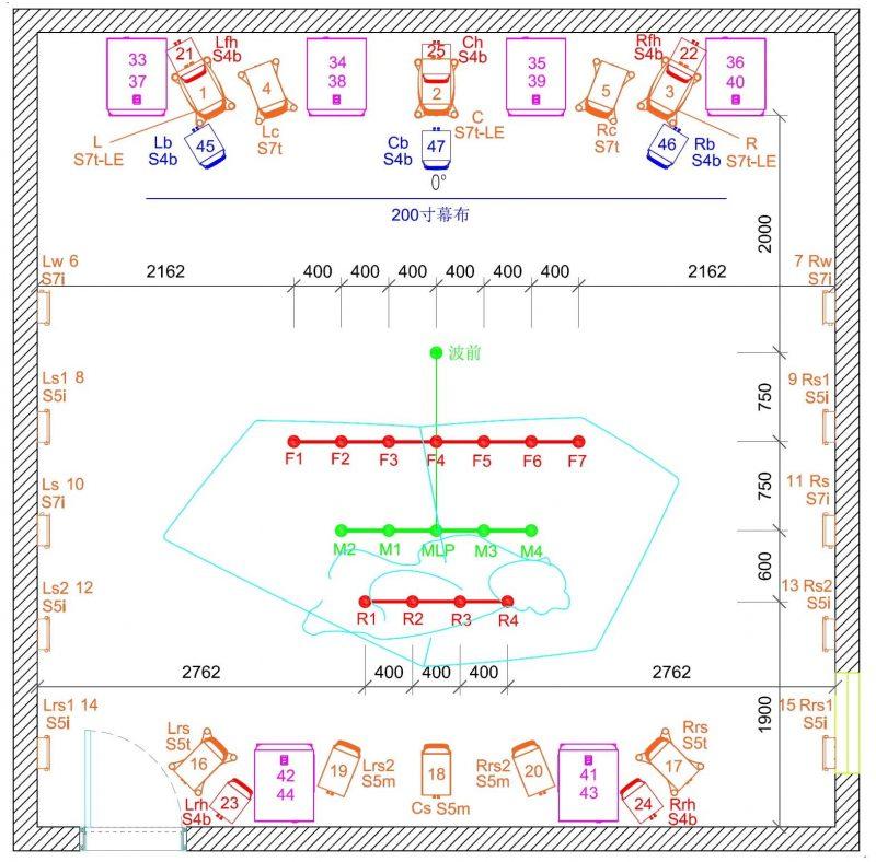 WaveForming测量区域要求前墙阵列与座椅最前端测量点之间的距离不小于2 米,测量区域与侧壁、天花板的距离不小于1 米,不得在距后墙低音炮 1m 以内的位置进行测量。测量点数最低要求需要麦克风位置能够覆盖整个聆听座椅区域,采集声场的多个样本充分了解房间模式,然后使用该信息构建过滤器,本案只有一个大号北极熊沙发,因此测量点设置不算复杂。一共三排测量点如图所示,前墙低音阵列到聆听座椅前端2米为基准点以此定位front (前方)点、middle(中位)点、rear(后方)点。