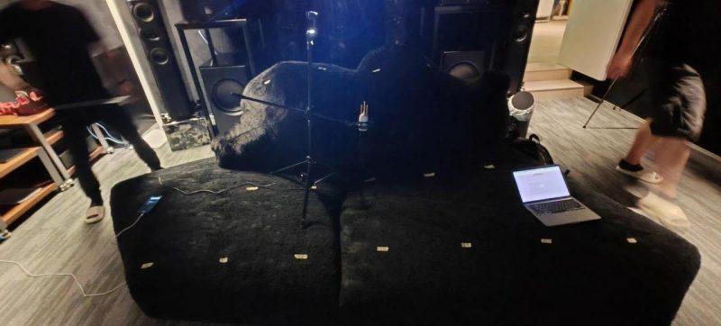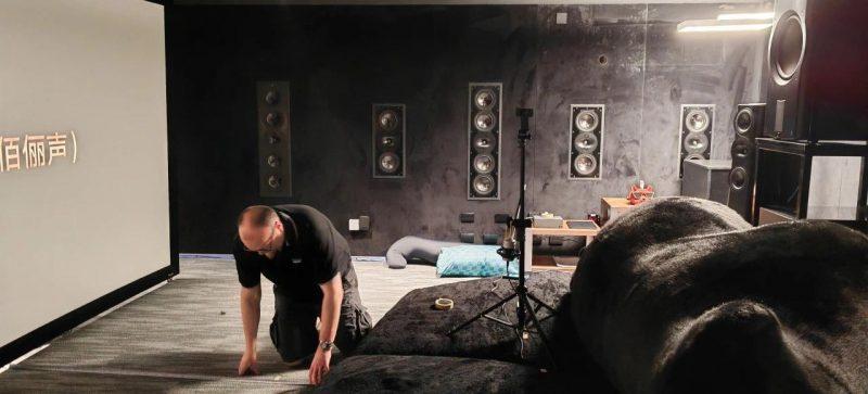 测量点middle(中位)5个图示为绿色,以座椅皇帝位为中心水平分布,麦克风高度和人耳平齐。图示红色是高位测量点,front (前方)加rear(后方)一共11个测量位置,麦克风高于耳朵60cm,距地140cm。本案例最少需要移动16个麦克风位置,12只低音炮总计需要测试192次。为了保证测量准确和有条不紊,我们准备了卷尺、美纹纸、记号笔,按照图纸在地面和沙发定位,贴好美纹纸作为后续麦克风摆放定位标记。