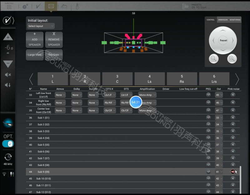 在Altitude32前级进行扬声器布局分配并且添加WaveForming超低音,运行测试音保证所有通道正确定义。