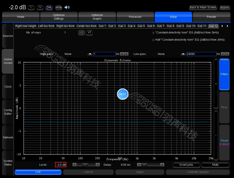 为了避免损害超低音,Trinnov推荐在active crossovers菜单根据超低音扬声器带宽添加高通滤波器, perlisten d215s实力足够强大,本次调试未进行高通滤波器限制。