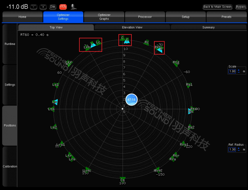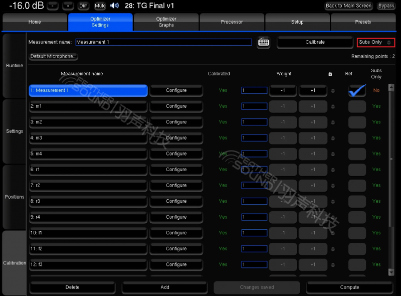 所有准备工作完成以后,接下来的影院系统、WaveForming校准和我们熟悉的Trinnov Altitude手动校准操作逻辑基本一致,首先测量和计算的是《Perlisten 47通道WaveForming测试点设计图》中所示的MLP(主要聆听位置),也就是我们俗称的皇帝位,同样还是进入Optimizer Settings菜单的手动运行calibration开始测量。