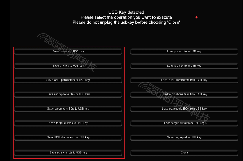 Trinnov推荐在WaveForming测量前特别是测量后备份预设,过程非常简单,使用小于8GB FAT32 格式的 USB 记忆棒插入Trinnov Altitude32设备背面的 USB 端口,出现弹出窗口后单击所有选项上的“保存”即可将数据完整备份。