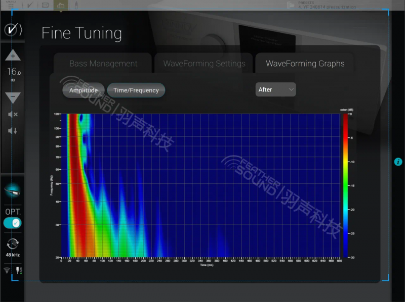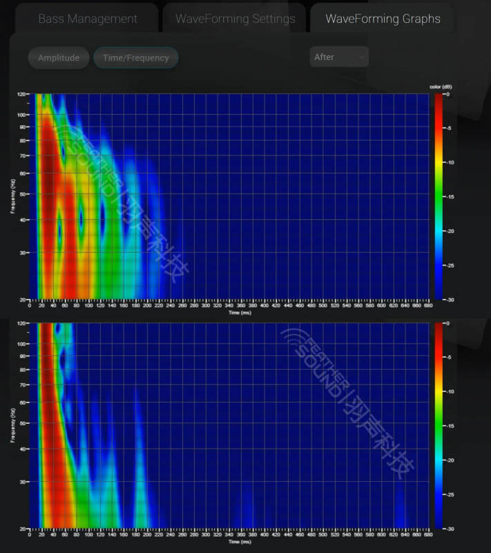 接下来我们就可以在WaveForming Graphs菜单查看加载WaveForming算法前后的时频和频域衰减成果对照图表,我们可以看到perlisten 47通道家庭影院项目的原始低频衰减缓慢拖沓,通过WaveForming滤波器修正以后除了极低频衰减时间稍长,其他40~120Hz频率都衰减都很快。