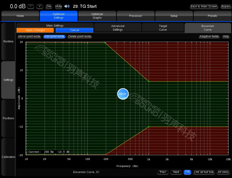 Trinnov Altitude 自4.3.1固件更新增加了新的功能Adaptive limiter(自适应限制器),这是为了防止环境噪声被误认为扬声器频率信号可能出现的过度校正,它基于校准开始时执行的环境噪声测量来判断和限制校正量。对于WaveForming 调试,Tom Garrett建议不开启自适应限制器,而是点击Add point mode在200Hz手动添加偏移曲线应用到每一个超低音。
