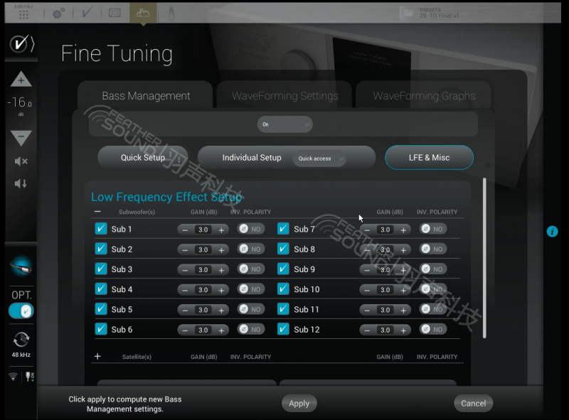进入bass management(低音管理)菜单Individual Setup子项将所有扬声器分频点以下频率的sub添加增益,以及进入LFE & Misc子项将LFE通道的12只超低音全部添加增益。