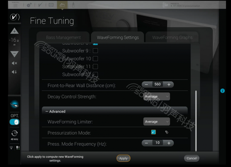 勾选Pressurization Mode然后点击Apply运算就可以开启加压模式,和衰减强度类似同样有几档选择,出于保护超低音不受损坏的原则推荐使用Average(平衡),WaveForming增压模式将会利用房间内安装的每个低音炮,最大限度地提高系统性能,增加冲击力、超低音输出能力和效率。