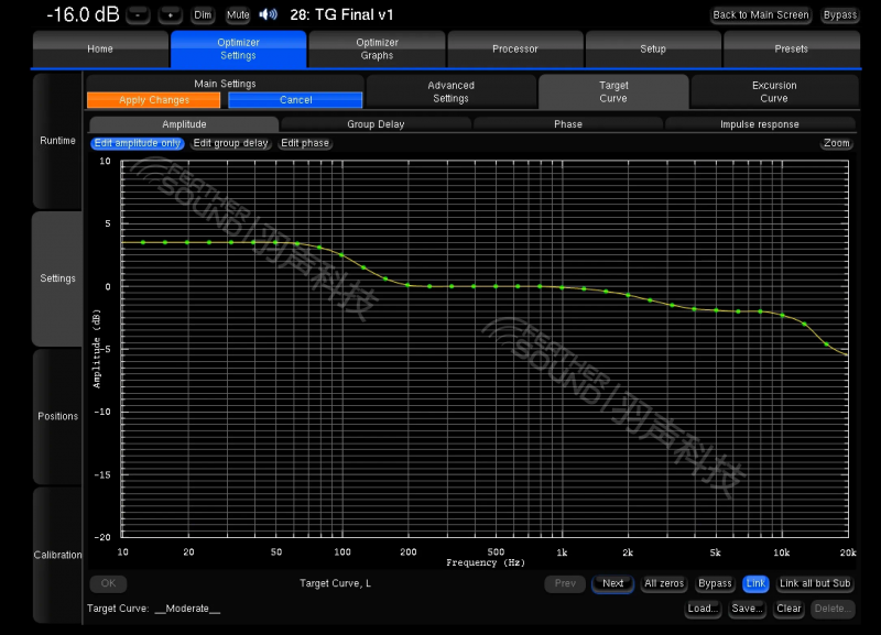 本案例Tom Garrett为所有的扬声器加载了Moderate(适中)预设目标曲线,但是所有超低音保持默认平直,这样只有音箱分频点以下的频率分配给sub才会被预设曲线强化,LFE通道保持平直没有加载预设曲线。一个原因是Tom Garrett认为超低音能量已经足够强大了不需要做额外提升,另一个原因和增压模式类似出于保护超低音使用安全考虑。