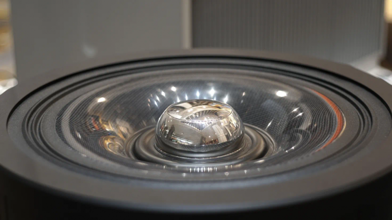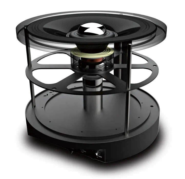 Wilson Benesch金驰带来了独家设计的推挽式结构,核心上没有传统意义上的动圈单元,动圈单元是将振膜放置在带有音圈的盆架内,而音圈则连接到盆架中心的刚性支架,该支架控制着振膜的位置,而橡胶折环则把振膜连接盆架的边缘。而相反的是,IGx发烧级低音炮没有盆架结构,在播放过程中,振膜由两个82mm超大音圈和两个高功率的NdFeB磁铁决定和控制,并以推挽形式运行。其中一个音圈和一个磁铁位于振膜正上方,形成振膜中心可见的镀铬盖,而另一个音圈和磁铁则位于IGx发烧级低音炮内振膜的下侧。两个磁铁和线圈依次围绕巨大的钢芯。这个钢芯轴垂直贯穿桶型箱体,为磁体和线圈提供稳定的支撑和散热,搭配无共振的桶型箱体更能够有效降低非线性失真。