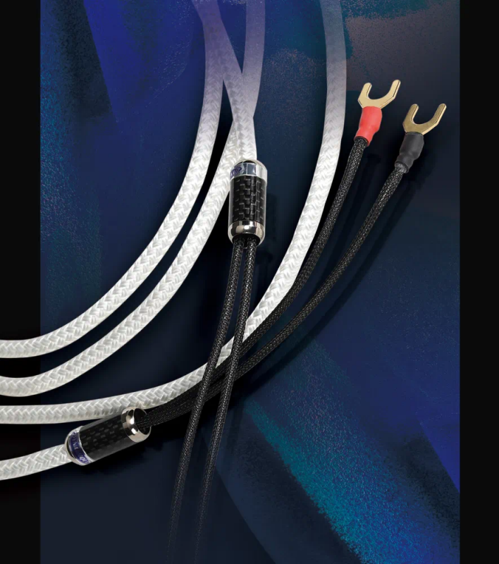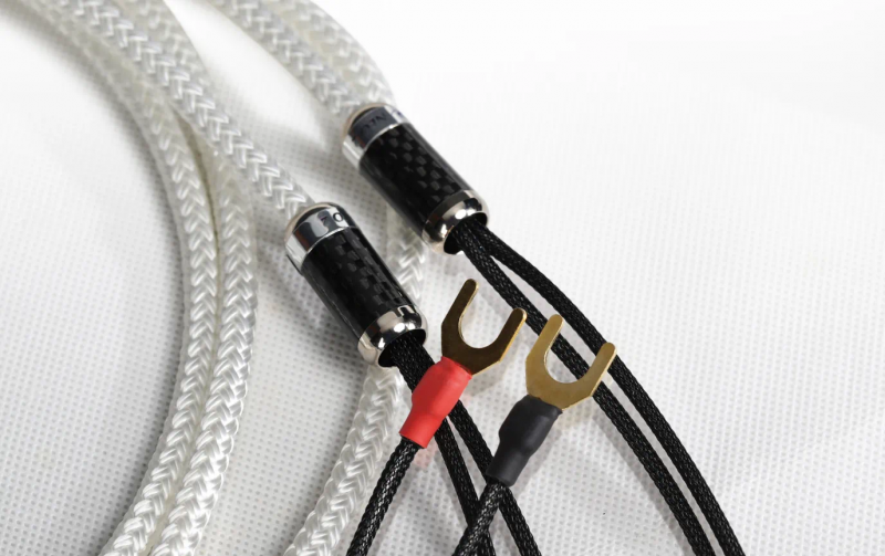 当把Dynamique Audio Neo 2喇叭线拿到手里,区别于我们常接触到的喇叭线,线身的纤细灵活是一大特色。Neo 2喇叭线很好地继承了Dynamique Audio的精粹,采用多股2X6AWG镀银无氧铜导体,这个规格足见其线身的纤细。绝缘材料采用FEP(氟化乙烯丙烯共聚物),以双绞线几何形状排列绕组。每条喇叭线配备2个独特的碳纤维谐振阻尼器,这种阻尼器由实心铝坯经过CNC机械加工、抛光、阳极处理制成,内部填充有吸收电磁干扰的专用材料,阻尼器采用高弹性胶粘接在线材之上,最终起到吸收电磁干扰和降低谐振的作用。