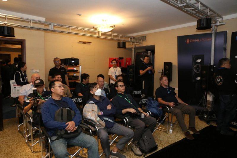 活动现场,采用通过了THX Dominus最高级别认证的Perlisten扬声器与超低音,构建了一个9.6.4的环绕声音响系统,旨在全面展现杜比全景声在三维声场构建上的卓越表现。此次演示所用的Perlisten 9.6.4声道家庭影院配置具体包括:前置左、中、右三个声道各配备了一只s7t音箱,环绕声道则使用了六只s5i入墙音箱,天空声道装备了四只s3ic吸顶音箱,而低音部分则由六只d215超低音组成。
