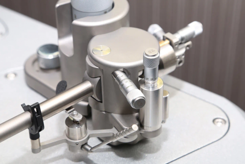 在Titan Grande Complication唱臂的基座位置,你可以看到一只嵌套在轴套里面的千分尺,有着细密的刻度,另外,微主轴也带有刻度标识,简直可以与高级钟表媲美。而正是千分尺和微主轴配合,就可以实现多达8种的唱臂调节方式,分别是: