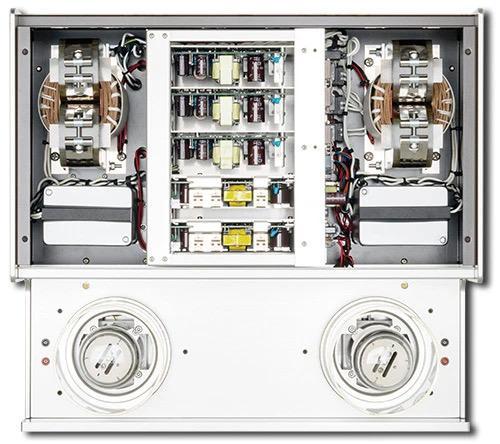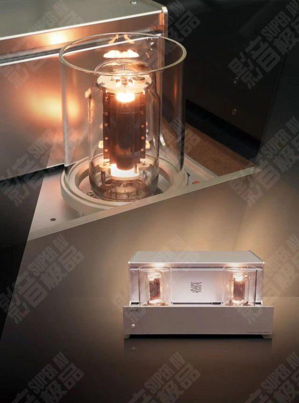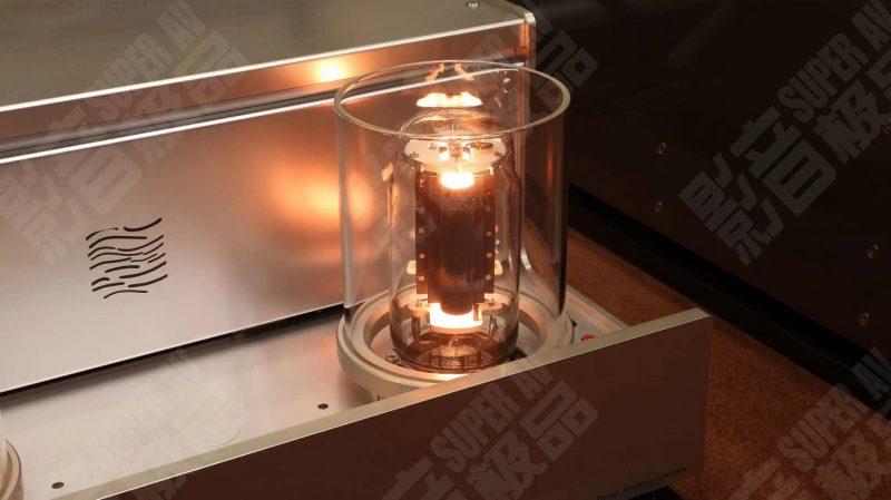 机盖顶部,左右各设置了一只大型电子管。值得注意的是,厂家没有选择常见的栅格方式来进行保护并且防烫,而是用两只透明的圆筒代替,首先从视觉观感上就别致很多,特别是电子管点亮之后借助镜面反射更有辉煌大气之感。