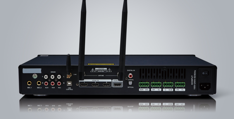 CT10SAKC-1四合一功放作為整個系統的中樞大腦,KC-1集成了多種功能於一體,提供了便捷高效的一站式解決方案。它簡化了設置過程,並確保了高品質音頻輸出,滿足家庭娛樂的各種需求。此款功放將傳統功放、KTV效果器、遊戲機以及電視機頂盒的功能合而為一,使得用戶可以輕鬆切換不同的娛樂模式。緊湊而現代的設計,加上黑色金屬外殼,既耐用又美觀。KC-1背面配備了豐富的接口配置,包括3個HDMI 2.1輸入端口和一個支持ARC/eARC技術的輸出端口,保證高清視頻和音頻的無縫傳輸,同時配有USB 2.0接口及Wi-Fi無線網絡連接,方便接入互聯網資源。