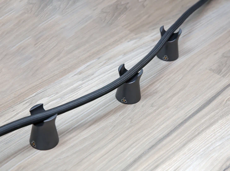 我们用音响架为的是什么?我们在音响器材和音箱底部配置垫材和脚钉为的是什么?这归根究底都离不开音响发烧友的一个恒久话题:振动。为了尽可能原汁原味地还原录音,日积月累的经验告诉我们,处理好振动问题确实有效可行。避震是很多音响发烧友在进行系统微调中的常规操作,但往细处想,无论是动用高级的音响架、垫材还是音箱脚钉,这些通通都是针对系统中音源、功放、音箱等这些常规大件器材,那么线材怎么办?连接总电源和器材的电源线,还有后级和音箱之间拖在地上长长的喇叭线,很多时候无可避免地“躺在”地板上,细微的振动经过层层叠加放大,影响是不可忽视的。就像平静的湖面飘落一块轻柔的树叶,泛起的涟漪足以波光粼粼。对于这些细枝末节的改善,我想到了Graphite Audio品牌,这次我试用CIS-40/CIS-60两种线托感受系统表现的变化。