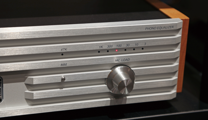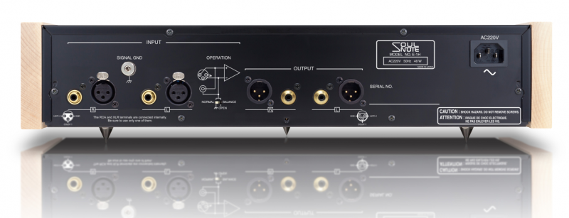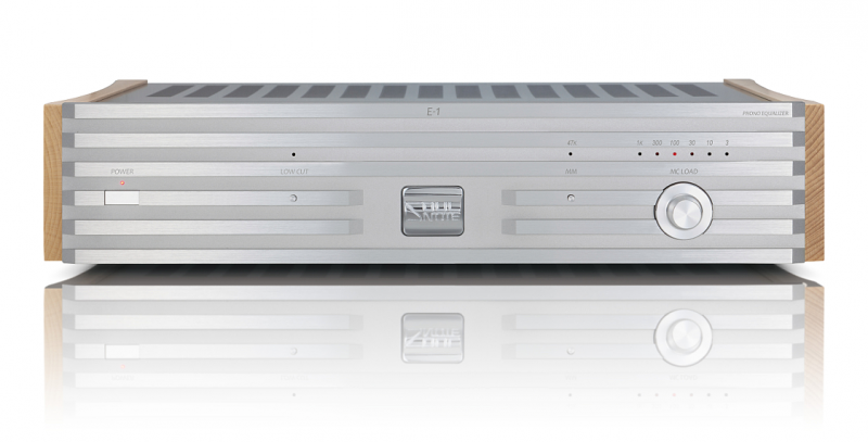 看看现场的这台SoulNote E-1唱头放大器,在其铝制前面板上的几道雕刻花纹个性十足,金属质感带来鲜明的优雅风格。SoulNote E-1是一台采用全平衡无负反馈线路设计的唱头放大器,支持MC及MM唱头。整机按键均在前面板中,前方分别有电源开关、LOW CUT FILTER、MM/MC选择、和MC的阻抗匹配(提供3Ω、10Ω、30Ω、300Ω、1KΩ等负载可供选择)。E-1机身两侧更配合以樱桃木饰板,令产品外观更为时尚大气。E-1随附三颗不锈钢脚钉,接上脚钉后为器材实现机械接地消除有害谐振。前面介绍到,1系产品是2016年为庆祝SoulNote成立10周年而推出,SoulNote E-1唱头放大器正是厂方蓄力10年后推出的精品。