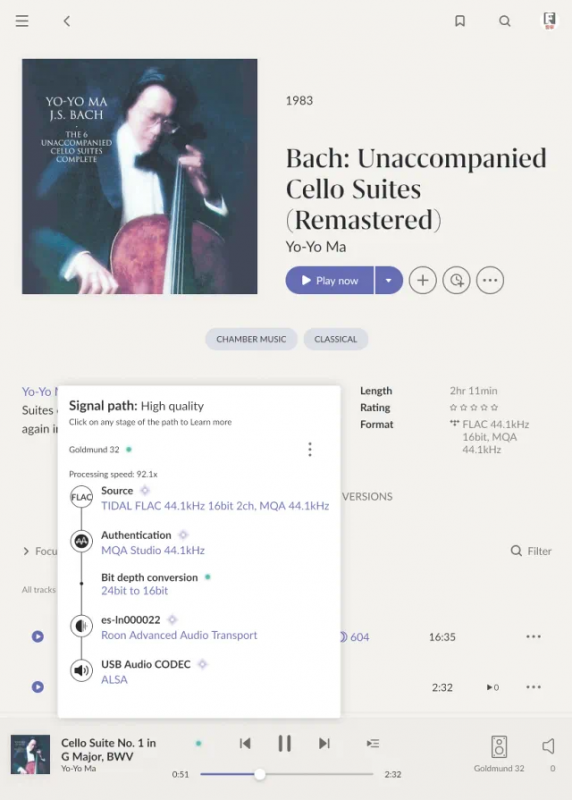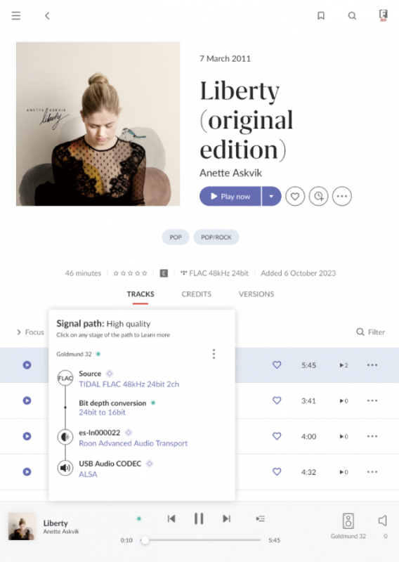 通过Roon播放内嵌Tidal流媒体音乐,例如近年非常大热的Anette Askvik《Liberty》,输出格式是FLAC 24bit/48kHz数字音乐,其规格满足Rhea 24bit/96kHz DSP数字处理器的传输和解码要求。当然,流媒体平台大部分都并非超高采样率,如果超过96kHz,系统会无法播放,但用户可以通过Roon的“降频”设定进行实现。或许有朋友会认为Rhea仅支持96kHz以下采样率表示并不理解,但这一点可以与Goldmund对声音和性能获得的平衡点上进行理解。而这种情况其实在瑞士某些品牌上也有出现,即使内部解码芯片规格可以支持DSD解码,但最终设定只支持PCM音频编码,抑或线路明明可以安装更高解码规格的芯片,却追求当年靓声之选的PCM1792。
