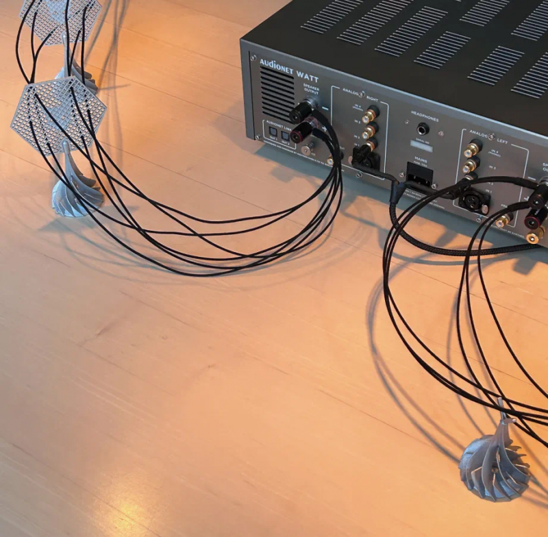事实上,Witchcraft喇叭线当中的六边形网格对很多线材制造商来说都十分熟悉,成为一个理线器的角色,架起的喇叭线就如同电网的输电铁塔。按照Voodoo Labs的理念,在使用Witchcraft喇叭线时,尽量避免任何一跟线材接触地面或物体,尽管这并非一件容易的事情,但声音的提升则不枉这些理线的功夫。演示的器材是Audionet Mach前级和Schrödinger单声道后级,音箱是美国PerListen(佰俪声)的S4b SE书架式音箱。