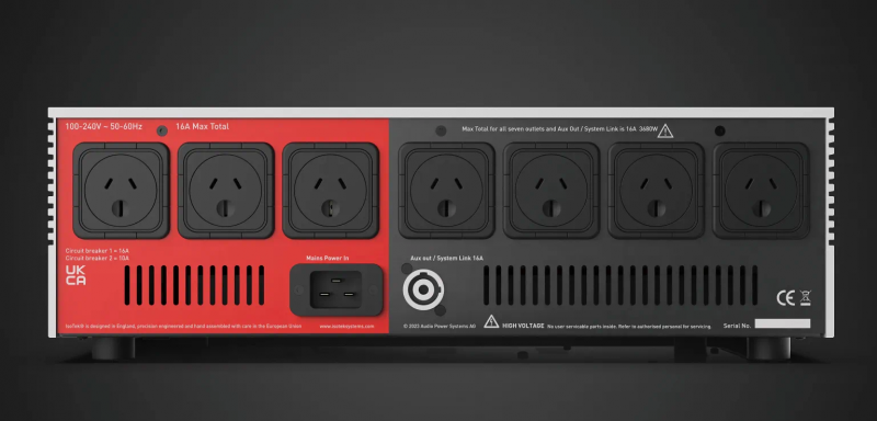 V5 Sigmas前面板樸實無華的極簡設計,轉過來看其背部,「乾貨」開始初見端倪。這裡可看到有7組電源輸出,每一組都是獨立插座,這樣的設計儘可能減少彼此間的干擾。這7組輸出中,其中4組電源輸出以黑色面板標出,為「中電流輸出」,以230V的版本來說,可輸出最大10A/2300W,便於用家接入耗電較小的器材。另外3組電源輸出以紅色面板標示,為「高電流輸出」,可輸出最大16A/3680W,可供給較大型的後級放大器等耗電需求較高的器材。
