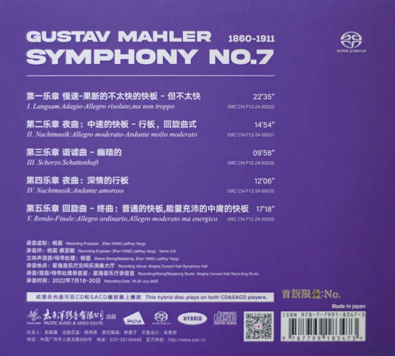 太平洋影音早前推出了马勒《升C小调第五交响曲》和《第六交响曲悲剧》两张专辑,已经吸引了我的关注,它们由深圳交响乐团演奏,林大叶指挥,录音地点分别为深圳音乐厅演奏大厅和星海音乐厅交响乐演奏大厅,不论是演出水平还是录音后期等制作水准,都堪称一流。而本次太平洋再度推出两张马勒专辑,分别是《D小调第三交响曲》和《E小调第七交响曲夜乐》,以绿色和紫色封面底色予以区别。