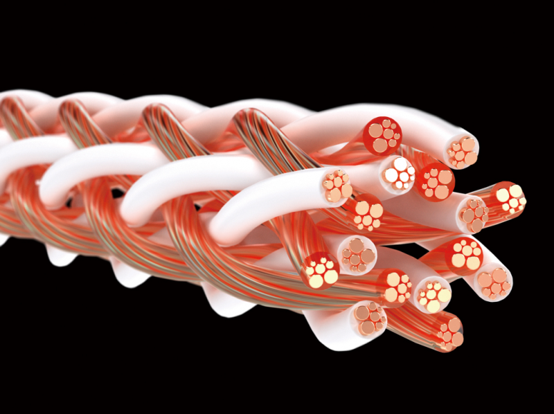 结构方面,4TC/8TC/12TC线材内部由8股/16股/24股(白色和透明)19.5AWG规格的无氧铜导体组成,对应每极(+/-)4股/8股/12股19.5AWG铜导体线规约为13AWG/9AWG/8AWG,而每一股导线中的导体,我们可以从线材截面图看到由7支线径不同的无氧铜导体混合而成,这种方式Kimber Kable称之为VariStrand™专利技术(VariStrand™的意思是把铜或银导体以多芯非等线径进行混合后,相互之间再进行缠绕,之所以采用多芯非等线径导体混合,Kimber Kable认为大线径的导体有利于低频,小线径的导体有利于高频,通过这种混合实现声音的自然与平衡)。相比采用单支实芯导体的导线,4TC/8TC/12TC喇叭线非常柔软。