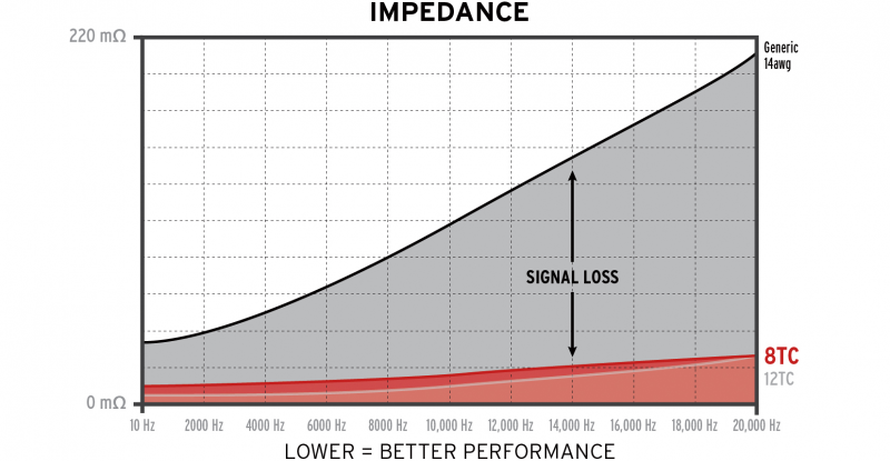 另外,Kimber Kable官网也提供了4TC/8TC/12TC的阻抗指标分析图,通过不同信号频段的测量,失真表现上,12TC比8TC略低,而8TC比4TC更低。而与普通14AWG线规导体的线材,4TC在高保真表现上遥遥领先。