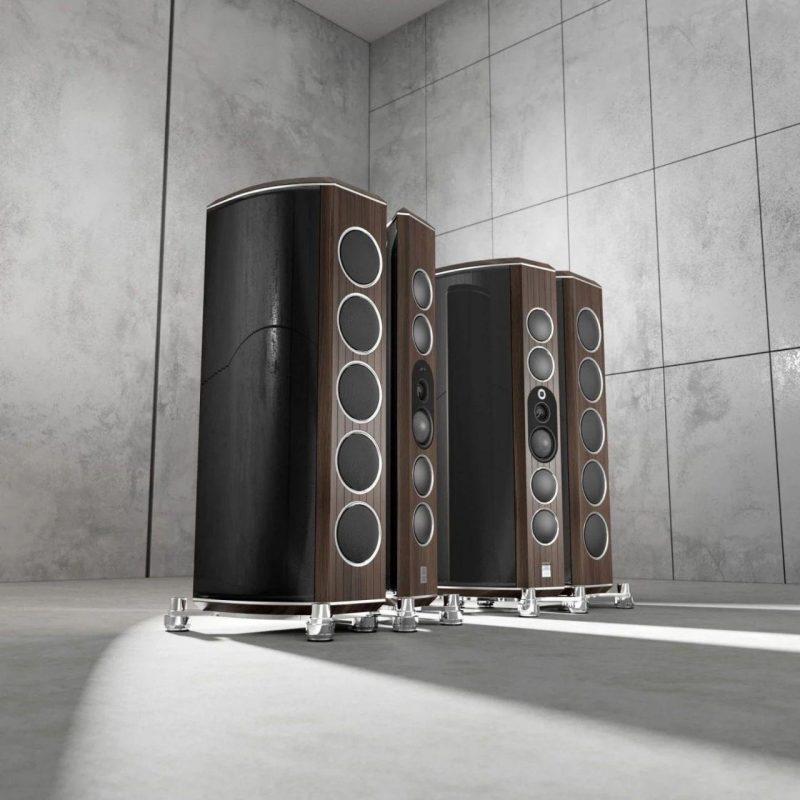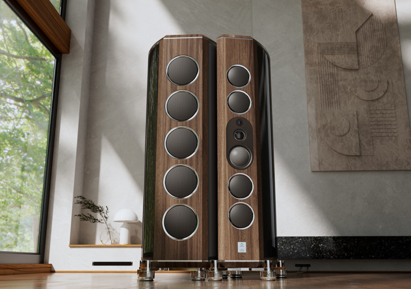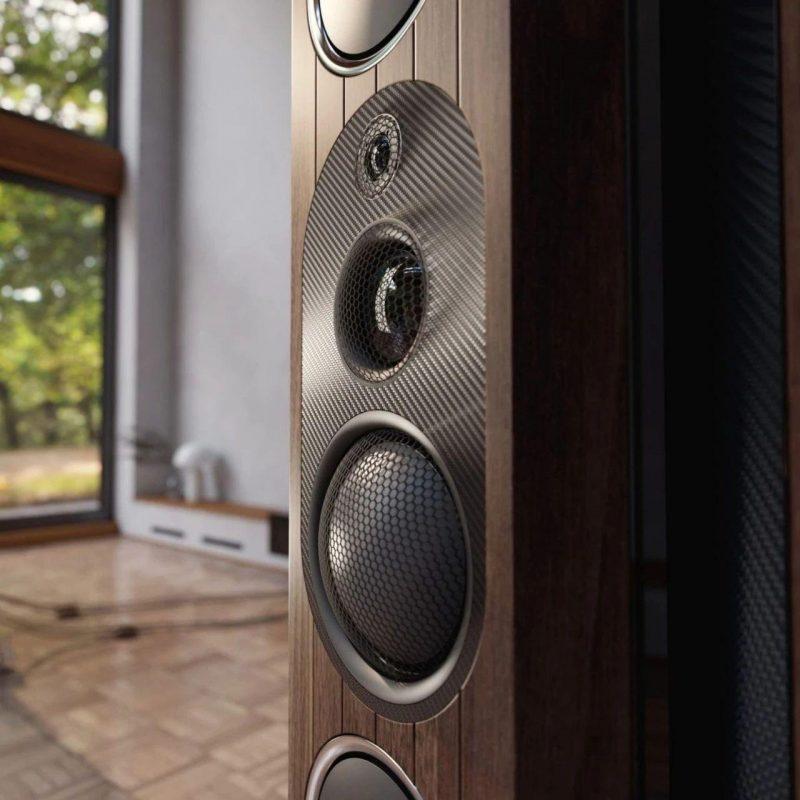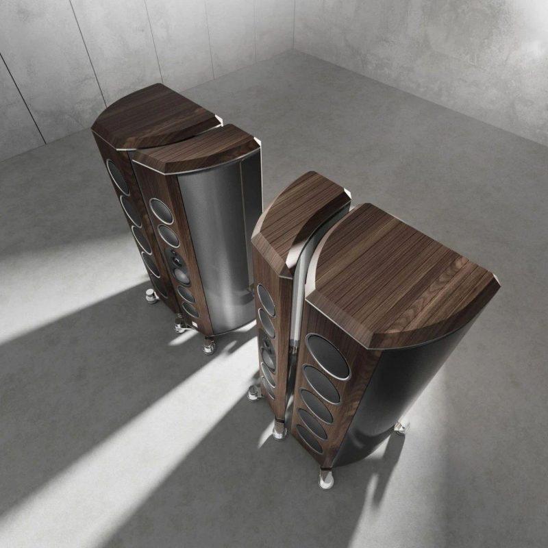 在今年的慕尼黑高级音响展上,Marten发布了两款突破性新品,其中一款为Coltrane Supreme Extreme座地式音箱。这款音箱采用五音路双塔式设计,配备无缝碳纤维一体式箱体。因为以四件式设计,所以Coltrane Supreme Extreme的低音部分和中高音单元完全分离。整个型号的单元配置可谓豪华,分别有1 英寸和 3 英寸纯钻石高音单元、一个 7 英寸铍中音单元和四个 8 英寸 Crystalid 中低音单元;低音塔则配置有五个10 英寸铝制三明治低音单元(带有十个无源辐射器)。
