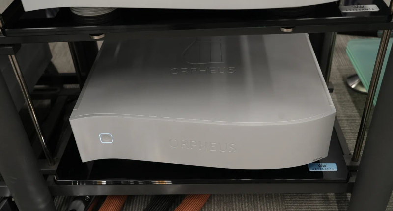 另一套演示系统也是高端好物,总值三百多万元的器材中,动用了西班牙WADAX、瑞士Orpheus、荷兰Live Cable、瑞典Marten等这些大牌。这套系统音源部分的Studio与WADAX Reference系列产品一脉相承,同系列的外置时钟和外置电源也是类似的造型。然而,Studio明显更具流线型,现代风格更强一些。Studio以单机单体设计,没有采用功能分离的分体式设计,没有独立的转盘或是流媒体机体,也没有外部电源,而是将DAC、转盘、流媒体电路、内置驱动电源全部一体化设计,使用起来更为方便。Studio的DAC数字/模拟转换器部分是最大的亮点之一,完全承继自Atlantis Reference系列中的DAC电路,一点也不缩水,可以是说WADAX品牌赖以成名的“独门绝技”。DAC电路中厂家独有的MusIC前馈纠错处理功能目前已经进化到第三代,双差分方式运作,处理精度达到128位。此外,Studio的数字电路时间校准至100ps,电源采用分布式调谐,具备30个交流调谐级和5个直流调谐级,电压轨上的总噪声仅为0.5µV (1Hz-100kHz)。